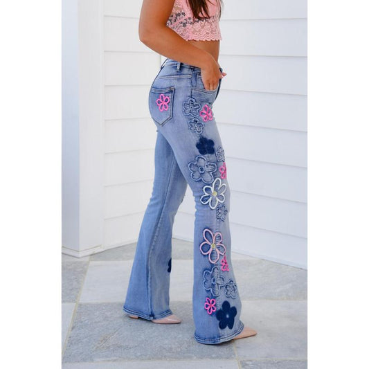 Mineral Wash Embroidered Retro Flower Flare Leg Denim Pants